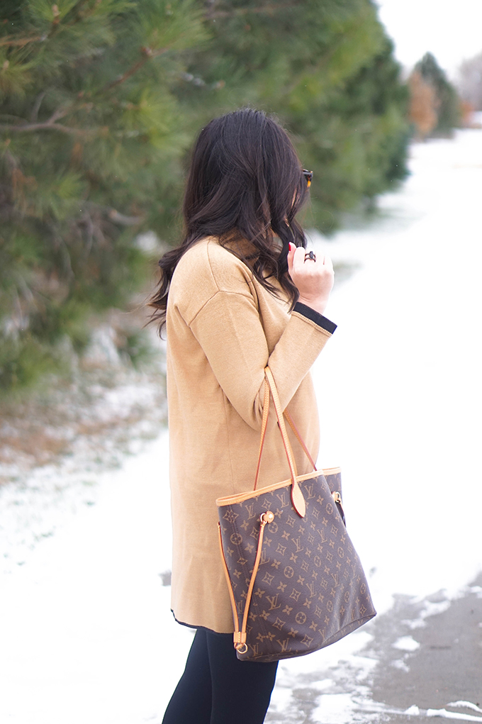 Today’s outfit consist of a classic color mix… black and camel. Even though both colors are complete opposite neutrals, they compliment each other very well. This camel sweater is the best! It’s one of those sweaters that you can wear lounging around the house. The black booties and tights gives off an edgy vibe, while the camel color adds a more comforting feel. Adding a white layering shirt or a leopard clutch would also go well with this look! There are endless amounts of ways you can style camel and black, which makes it my two favorite mixing colors!